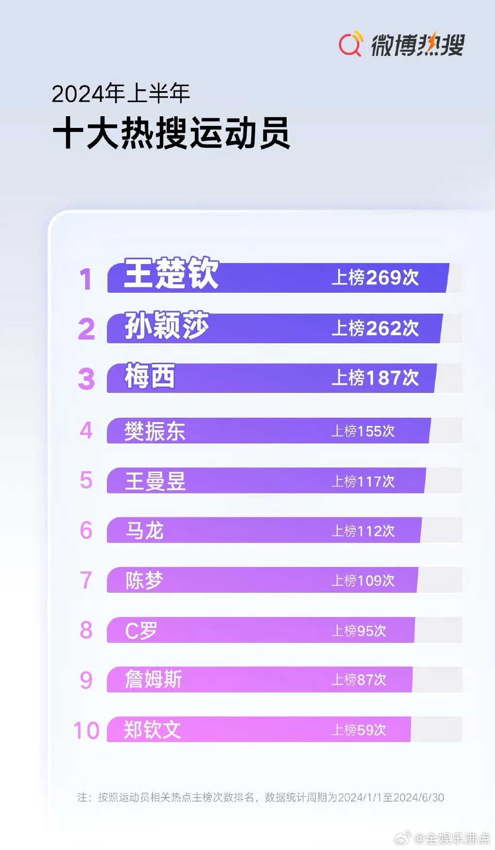 2024年微博十大热搜运动员:乒乓球7席&占据前3,足篮无人上榜 2025-03-01 13:07:45 综合报道 90℃ 0 03月01日讯 微博热搜发布了2024年全年的十大热搜体育运动员,其中乒乓球运动员占了7席,另外3人为网球郑钦文,跳水全红婵,游泳潘展乐。足球和篮球运动员则是无人上榜。而在此前发布的2024上半年热搜中,还有着梅西C罗和詹姆斯这样的足篮球员。 标签: 十大乒乓球 上一篇:纳瓦罗止步迪拜站第三轮,郑钦文保住世界第8排名 下一篇:官方:卫冕冠军奥沙利文因身体原因退出斯诺克世界大奖赛 相关推荐 ⚽️👀🎾胡梅尔斯和女友现场观战ATP斯图加特站决赛 WTA250斯海尔托亨博斯站:袁悦击败比勒尔 首次闯入草地巡回赛8强 吕小军:只要意志坚定就没有到不了的高度 40岁 我还在努力 出战主场比赛!阿斯顿马丁车手斯特罗尔自宣将出战F1加拿大站